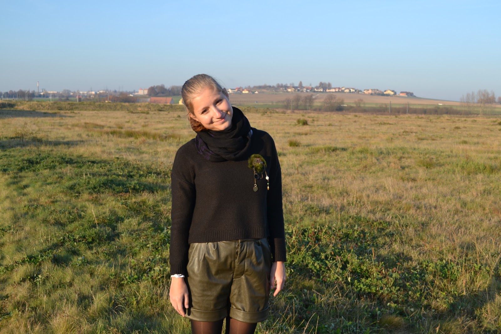 Scarf ???, sweater and tights H&M, shorts NewYorker, brooch Amélie Perger, boots Topshop